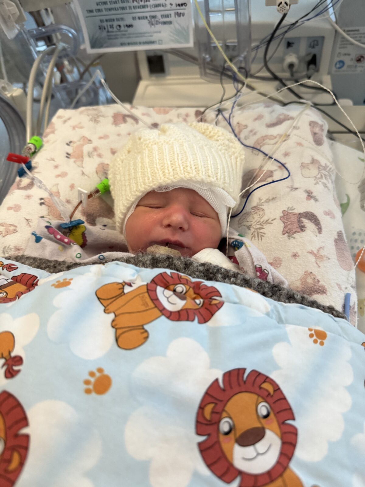 Millie was admitted with HIE, possible sepsis, and meconium aspiration. It appeared her cord had begun failing, likely causing her small size in addition to the entanglement. She was placed under induced hypothermia cooling treatment for 72 hours to protect her brain. Those days were the longest of our lives, as we waited for the MRI that would tell us what her future might hold.